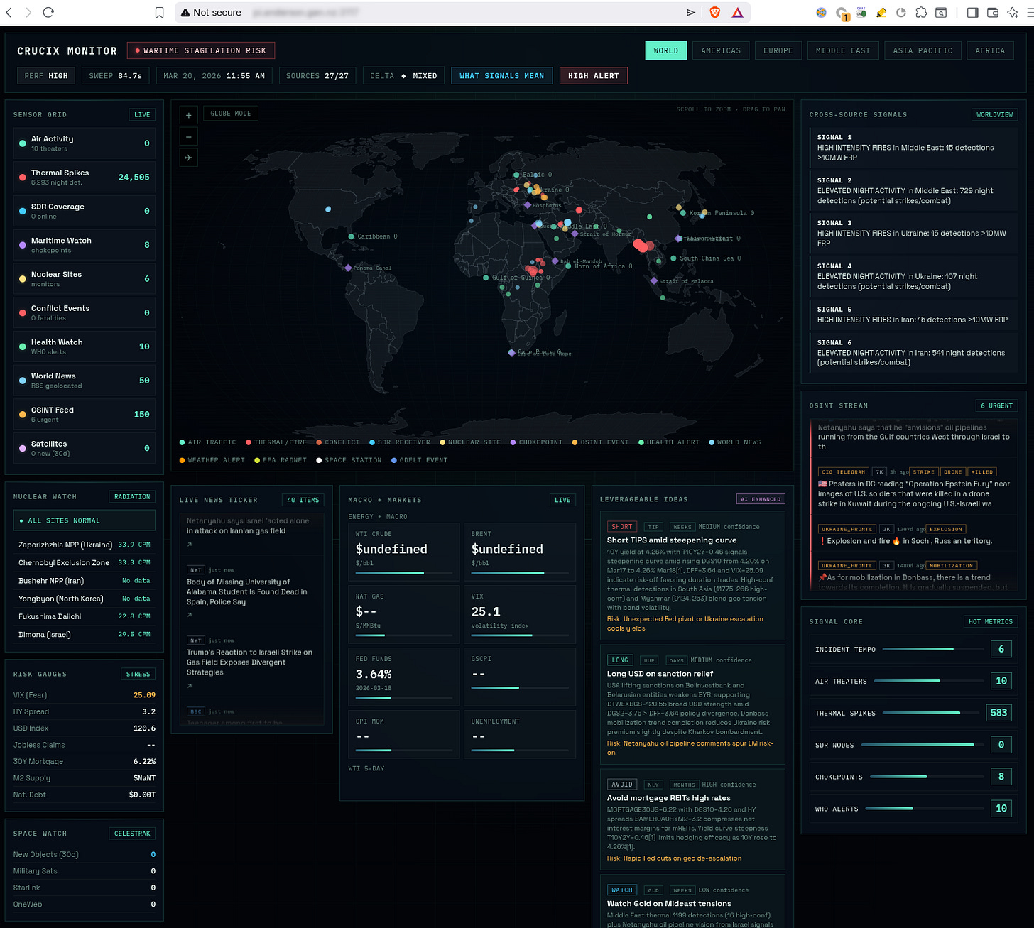 Crucix runs locally on my own hardware, pulling in news articles, satellite imagery, radiation levels, conflict events, economic indicators, flight tracking, maritime activity, social media content and market data. It displays this information on a 3D globe featuring fire detections, air traffic, radiation sites, maritime chokepoints, SDR receivers, OSINT events, health alerts, geolocated news and conflict events. Alongside this are risk gauges and news tickers.
