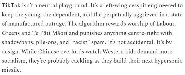 Consumer preferences matter though. The userbase of Tiktok tracks younger than other platforms. Less educated, less affluent, superficially informed, more ethnically diverse. And of course many are seeking entertainment over edification which is entirely legitimate. In my opinion this userbase is particularly susceptible to manipulation whether practised by ByteDance on behalf of the Chinese Communist Party or domestically by the far-left politicians in New Zealand producing puerile content tailored to their limited attention spans.