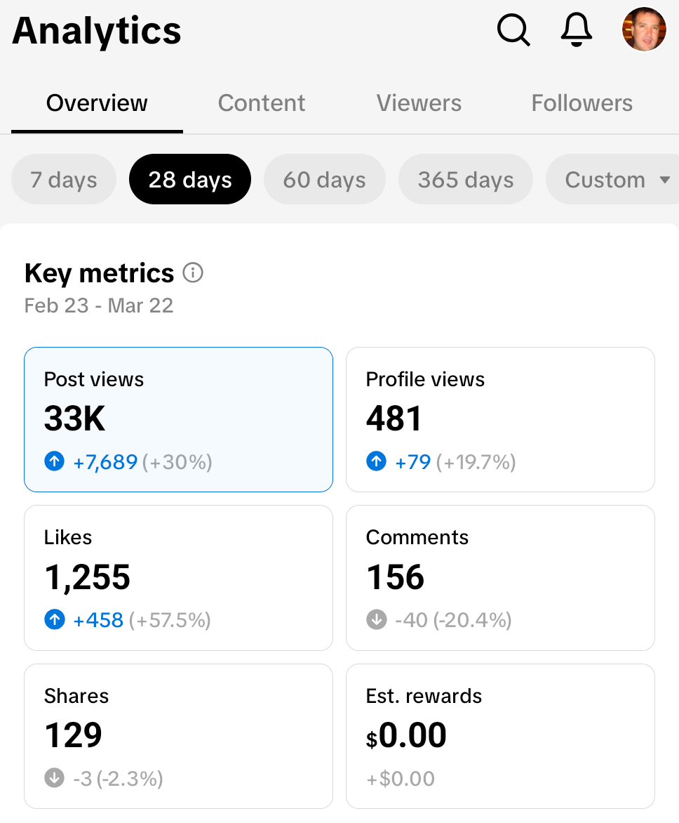 Kahurangi includes in his article a screenshot of his first week on the Tiktok platform, showing a view count of one million views. An impressive amount, and a testament to the demand for humorous AI-generated content. In contrast, the sort of content I produce gains nowhere near that amount of traction: